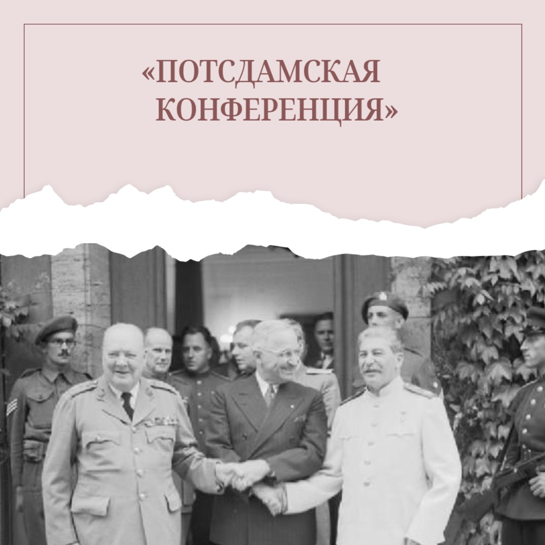 Потсдамская (Берлинская) конференция – третья и последняя официальная встреча лидеров трёх крупнейших держав антигитлеровской коалиции во Второй мировой войне – СССР, США и Великобритании. В конференции участвовали председатель Государственного комитета обороны СССР Иосиф Виссарионович Сталин, президент США Гарри Трумэн, премьер-министры Великобритании Уинстон Черчилль (до 25 июля) и Клемент Эттли (с 28 июля). Потсдамская конференция состоялась после победы над гитлеровской Германией и в преддверии вступления СССР в войну с Японией для выработки послевоенной программы мира и безопасности в Европе и мире с 17 июля по 2 августа 1945 года в городе Потсдам (близ Берлина).