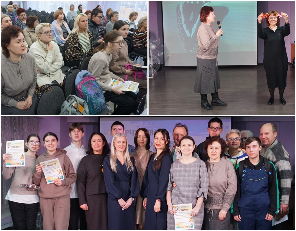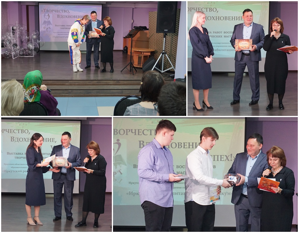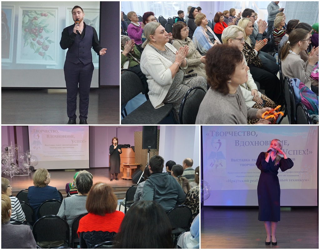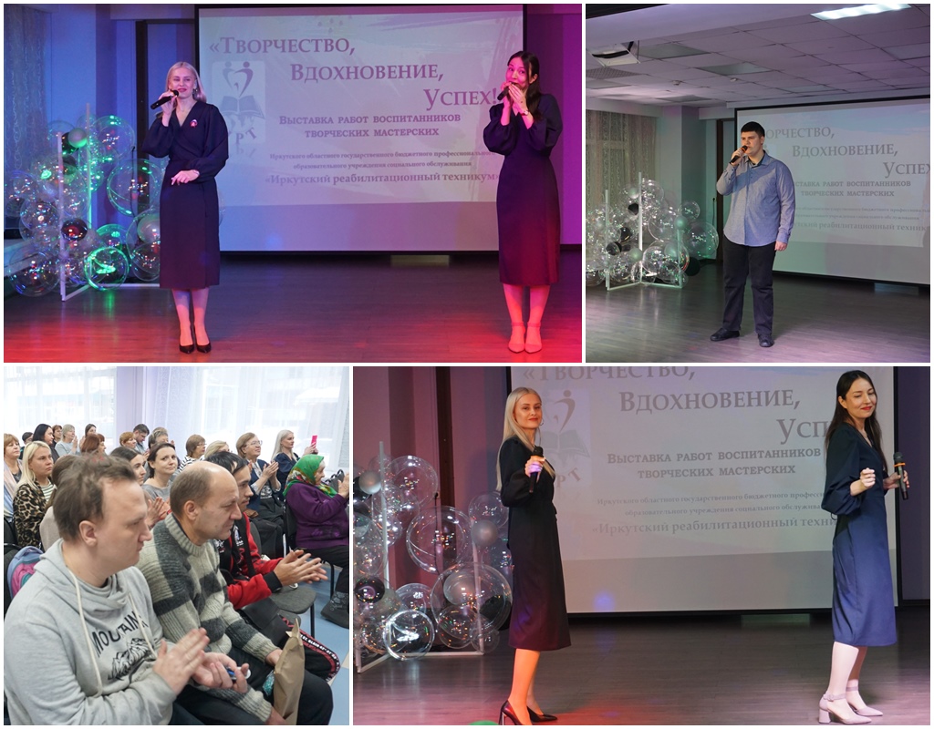 Программу открыла песня «Мамины глаза» в исполнении воспитанника техникума Ивана Шишлянникова. Порадовали зрителей педагоги ребят – вокалисты Елизавета Протопопова и Ольга Борисова, музыкант-виртуоз Лев Еранцев. Подарками и благодарственными письмами были отмечены все выступавшие, а также авторы представленных работ. Выставки произведений одарённых студентов Иркутского реабилитационного техникума проводятся в стенах центра ежегодно, более десятилетия продолжается сотрудничество образовательного учреждения с нашим учреждением культуры. Аплодисментами зрители приветствовали наставников ребят – Любовь Юрьеву, Ирину Наумову, Татьяну Тихонову, заместителя директора по реабилитационно-воспитательной работе Веру Махно. В ответном слове руководитель мастерской «Гончарное дело» Е. Нагольнова подарила коллективу Гуманитарного центра новогодние игрушки – лошадок огненного цвета, талисман года и символ успешного сотрудничества.