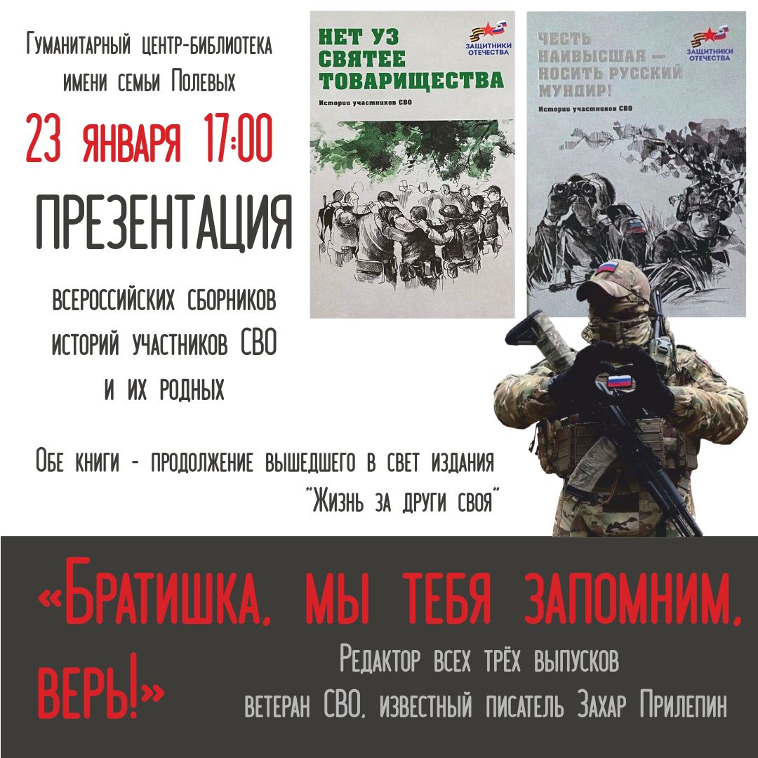 23 января в 17:00 часов в Гуманитарном центре-библиотеке имени семьи Полевых состоится презентация всероссийских сборников историй участников СВО и их родных «Нет уз святее товарищества» и «Честь наивысшая – носить русский мундир!» (2024). Обе книги – продолжение вышедшего в свет издания «Жизнь за други своя», выпущенного в том же году фондом «Защитники Отечества» и ставшего лауреатом премии «Книга года - 2024» в номинации «Герой нашего времени».