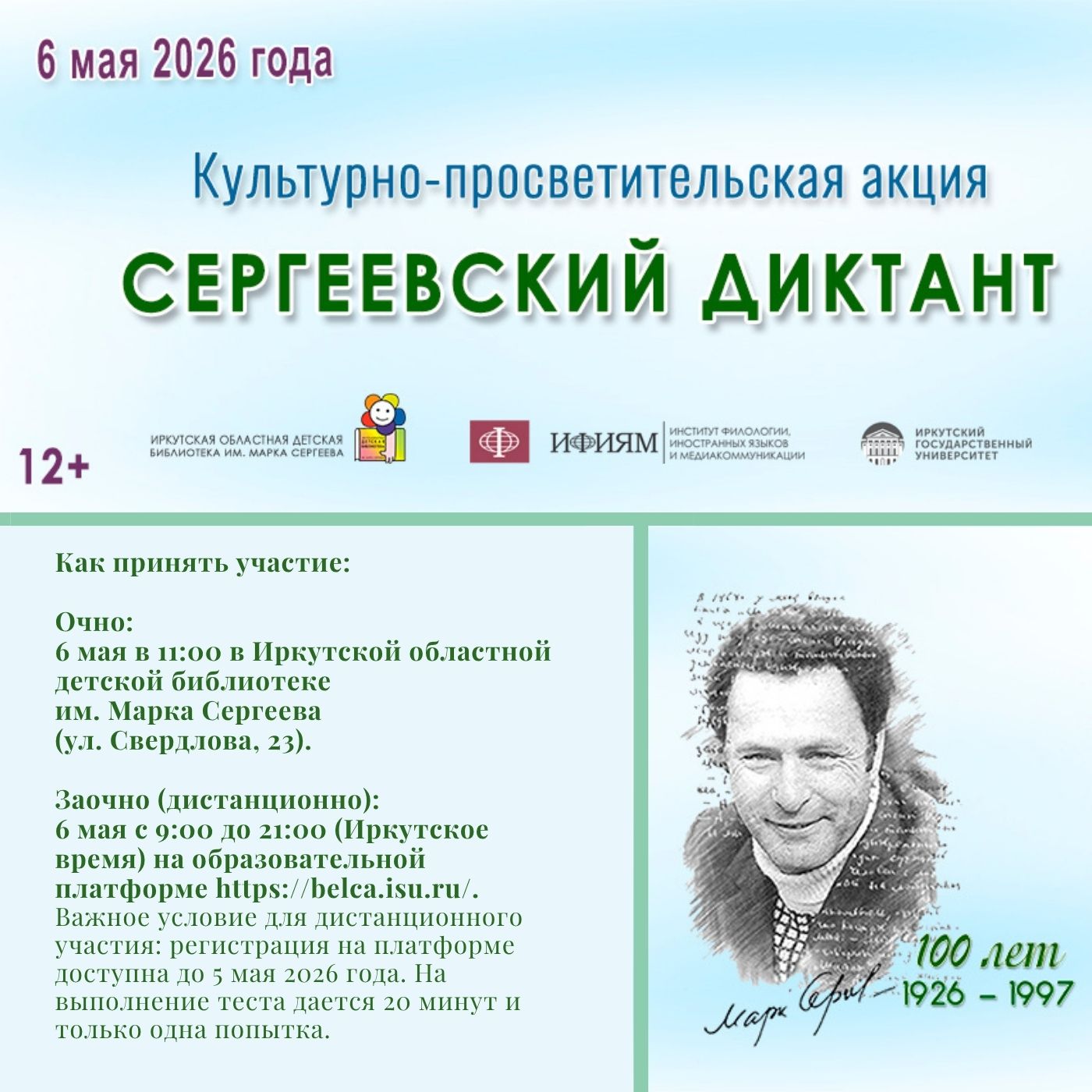 Иркутская областная детская библиотека им. Марка Сергеева совместно с кафедрой новейшей русской литературы ИФИЯМ ИГУ проводит Сергеевский диктант. Мероприятие приурочено к 100-летию со дня рождения выдающегося иркутского писателя, поэта и публициста Марка Давидовича Сергеева.