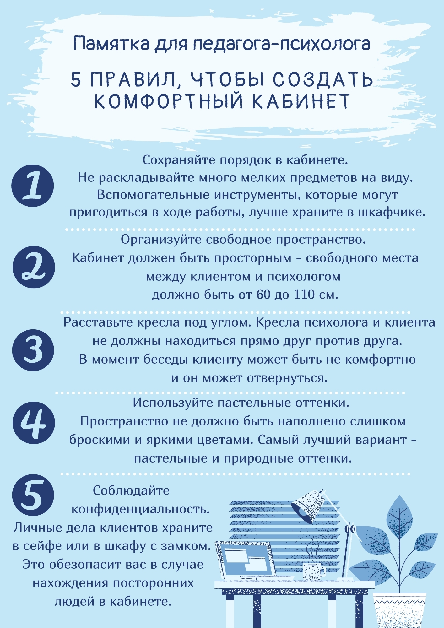 О том, как правильно это сделать вы узнаете из журнала «Справочник педагога-психолога. Школа №7/2019», с которым вы можете познакомиться в информационной службе «Образование». По материалам этого журнала была подготовлена памятка, с подсказками о том, как создать комфортный кабинет. Также в этом номере вы найдете план-схему кабинета-психолога и чек-лист о готовности рабочего кабинета к началу учебного года.